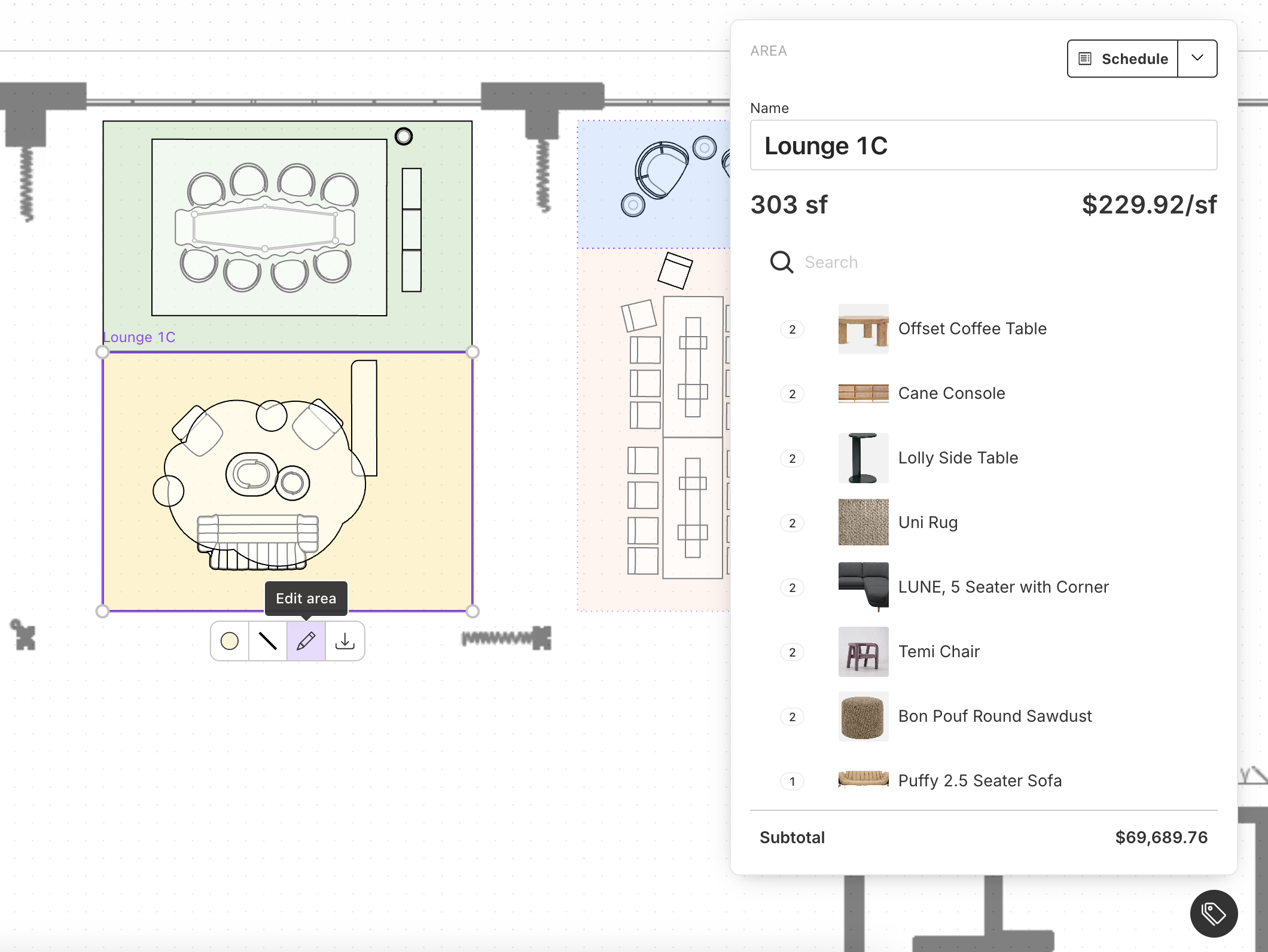 You've used Canvas to create visuals like collages and vignettes, lay out your floor plans to scale, and even put together a furniture specification presentation and product list. Now, with the addition of **Areas**, you can start to break down your floor plan with smart areas that capture programming, square footage, and make your existing Product Lists more detailed and searchable.&#x20;