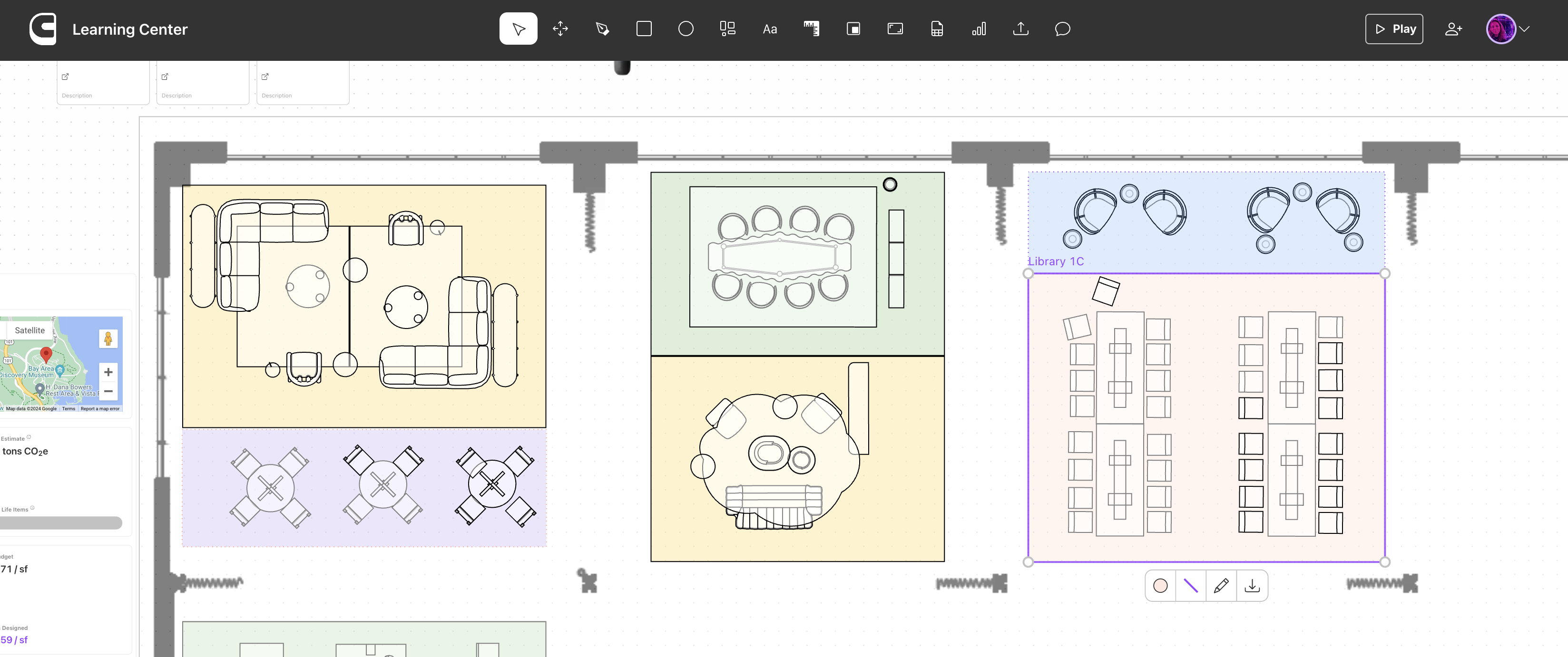Within Canvas, Areas are containers in which you group spaces with the furniture that is placed inside them. For example, you can have Areas for different room types - like, Conference, Lobby, Cafe, Library, and so on. Drawing Areas are helpful to overlay on top of your floor plan to better organize a floor plan or presentation. Canoa's Areas are smart; meaning, when you click into them, they provide dynamic metrics of that grouped space. Areas can also be filtered in Dashboards and Product Lists that live on the Canvas, making them more narrowed down and no longer capturing the entire Canvas.